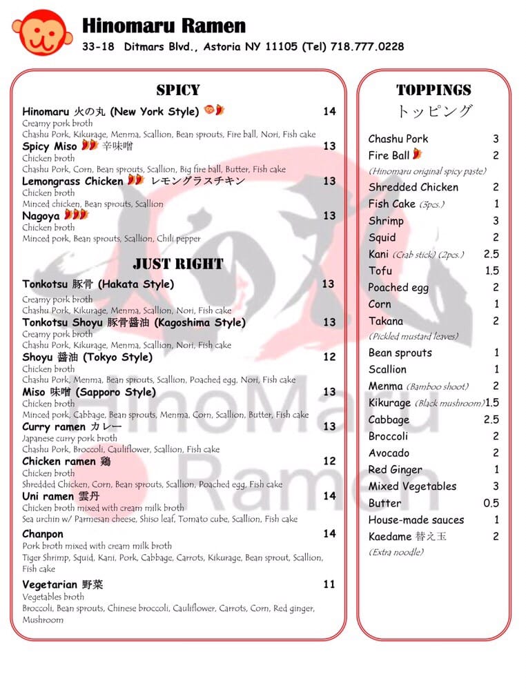 HinoMaru Ramen in Astoria, NY, offers a diverse menu with options for pescatarians, vegans, and vegetarians. Their signature Spicy Ramen features a creamy pork bone broth cooked for 17 hours, topped with braised chashu pork, kikurage, and other flavorful ingredients. The Tonkotsu Shoyu Ramens are also a popular choice with tender chashu pork and savory toppings. Customers rave about the rich broths and the attentive service, making it a standout spot for ramen lovers. The cozy wooden interior, outdoor seating, and excellent menu options make HinoMaru Ramen a must-visit for those craving authentic Japanese flavors. The positive reviews from patrons highlight the restaurant's commitment to quality and delicious offerings, making it a go-to spot for a satisfying dining experience.