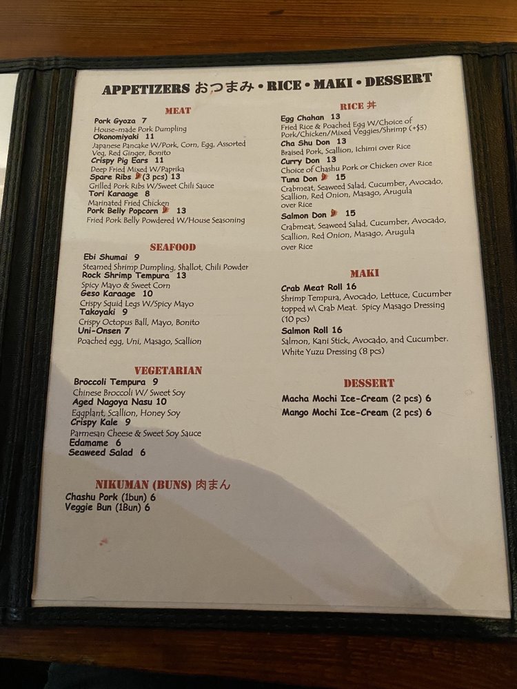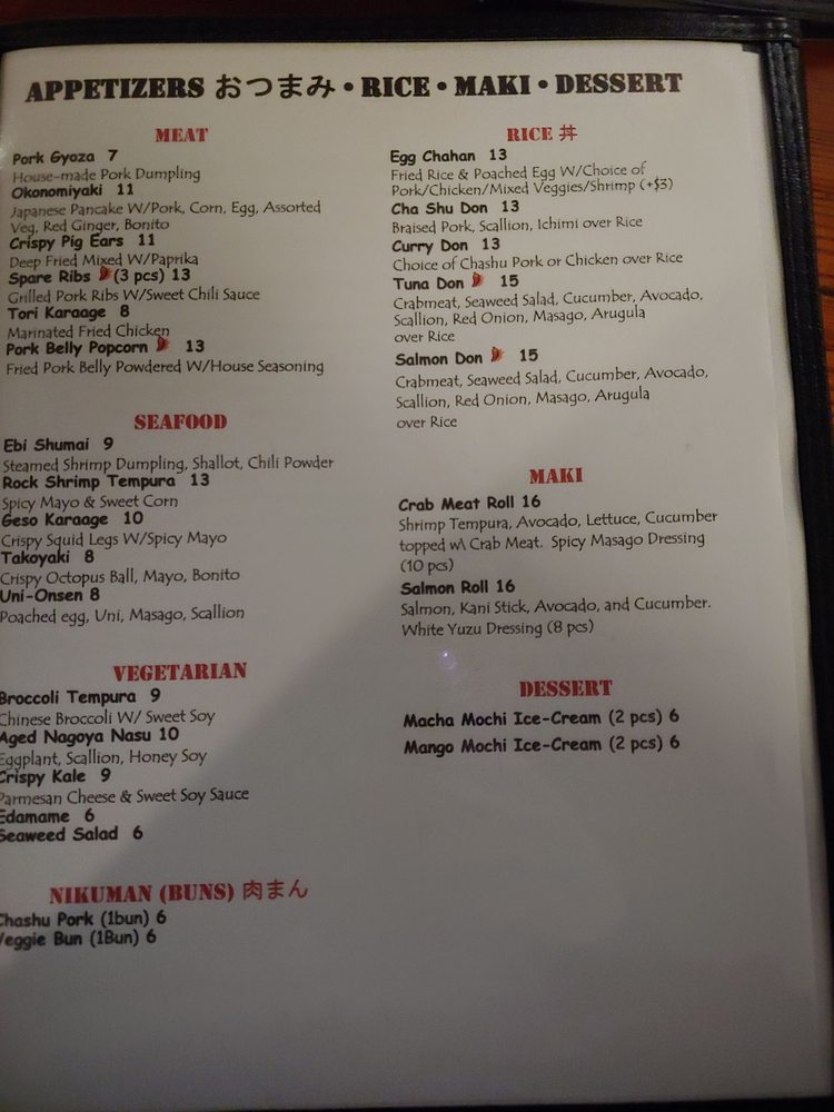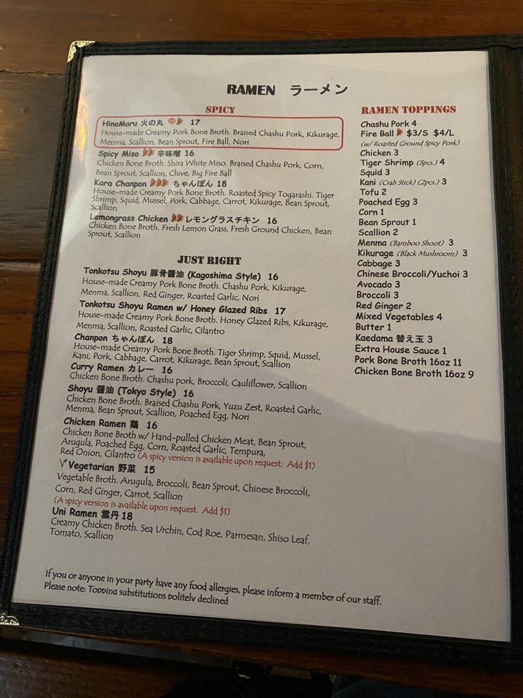 House-made, Creamy, Hakata-style Pork Bone Broth prepared for 17 hours. Tiger Shrimp, Squid, Mussel, Kani, Pork, Cabbage, Carrot, Kikurage, Bean Sprout, Scallion. (Substitutions politely declined)