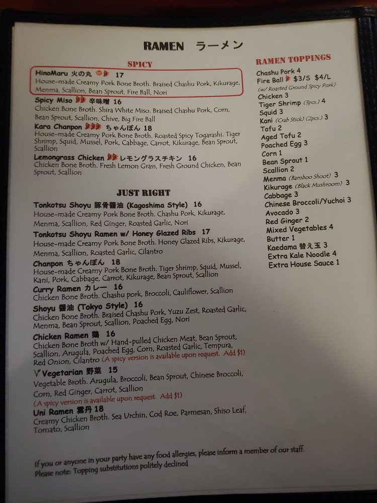 Chicken Bone Broth. Shira White Miso. Braised Chashu Pork, Corn, Bean Sprout, Scallion, Chive, Big Fire Ball. Spicy. (Substitutions politely declined)