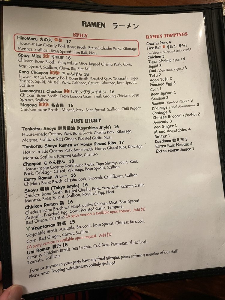 Sapporo style chicken broth with minced pork, cabbage, bean sprouts, menma, corn, and scallion. (Substitutions politely declined)